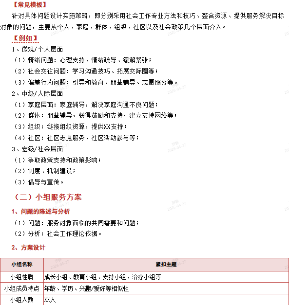 方案设计题是中级社工实务考试中分值占比高、难度大的题型,考生常因“逻辑混乱、细节缺失、脱离实务”而失分。本部分《方案设计题模板》以“高效抢分”为目标,提供社区服务、小组服务、小组活动三大核心场景的标准化框架,结合目标设定、策略选择、资源整合、评估方法等关键步骤拆解,助你快速搭建高分方案!