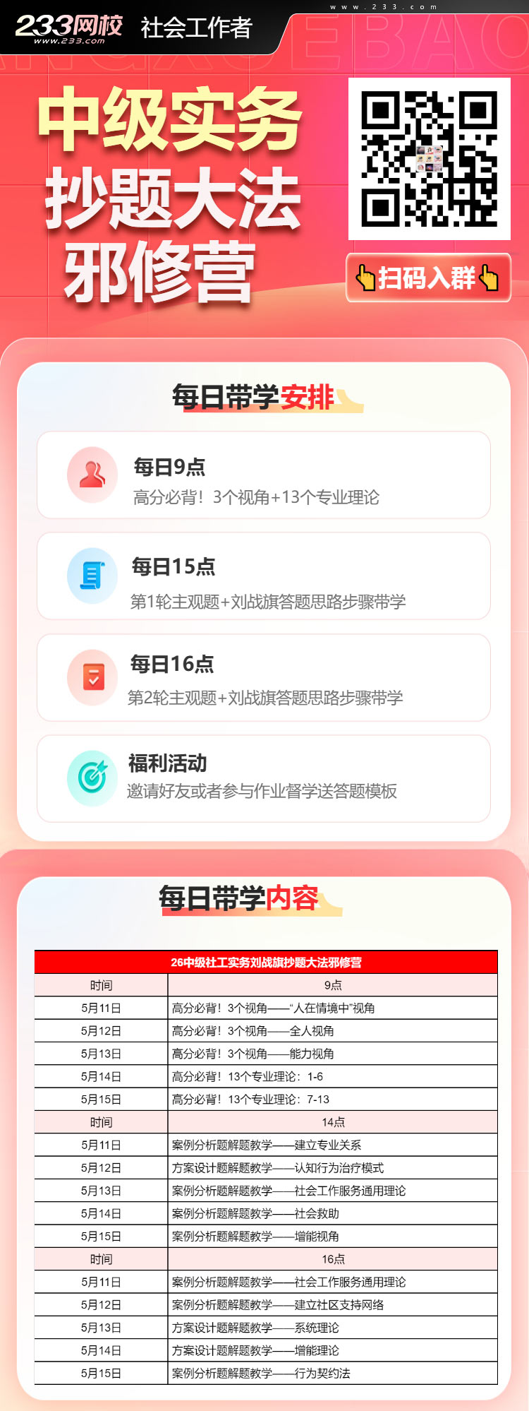 中级社工实务的考友们,你是不是也有这种绝望瞬间?案例分析长篇大论,结果一看答案,5个点只踩中1个?方案设计脑子一片空白,写着写着成了“流水账”? 明明背了知识点,一到考场上就是写不出“专业词汇”?别再无效努力了!中级实务要想通关,靠的不是死记硬背,而是“模板思维”。为了帮助大家摆脱“下笔难”的困境,233网校教研团队根据2026年最新考纲,整理了一份超级硬核的备考礼包——中级社工实务答题模板电子版免费领取!