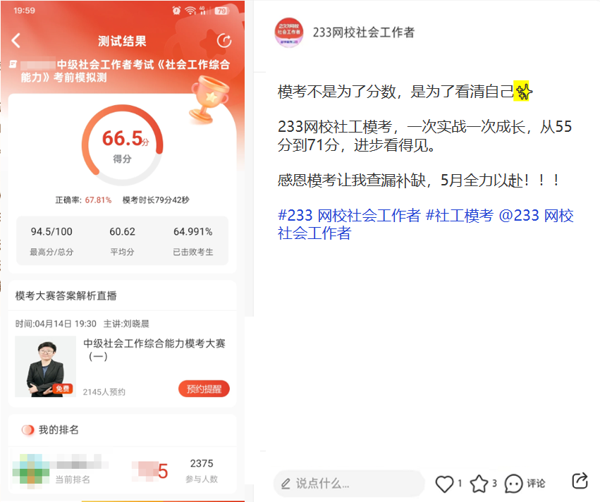 1、发小红书笔记晒233网校社工模考分数 / 预约截图,图文、短句、心得形式都可以。