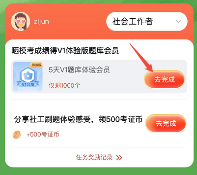 第③步,选择参与的活动:晒模考成绩,送5天V1题库体验会员!