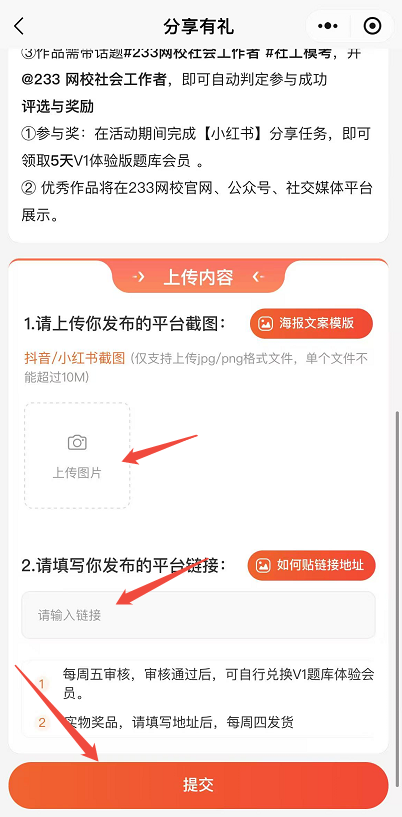 第⑤步,按上述要求发布小红书笔记,即送5天V1题库体验会员,每周五审核后,V1题库体验会员自行在提交页面兑换,科目任选。