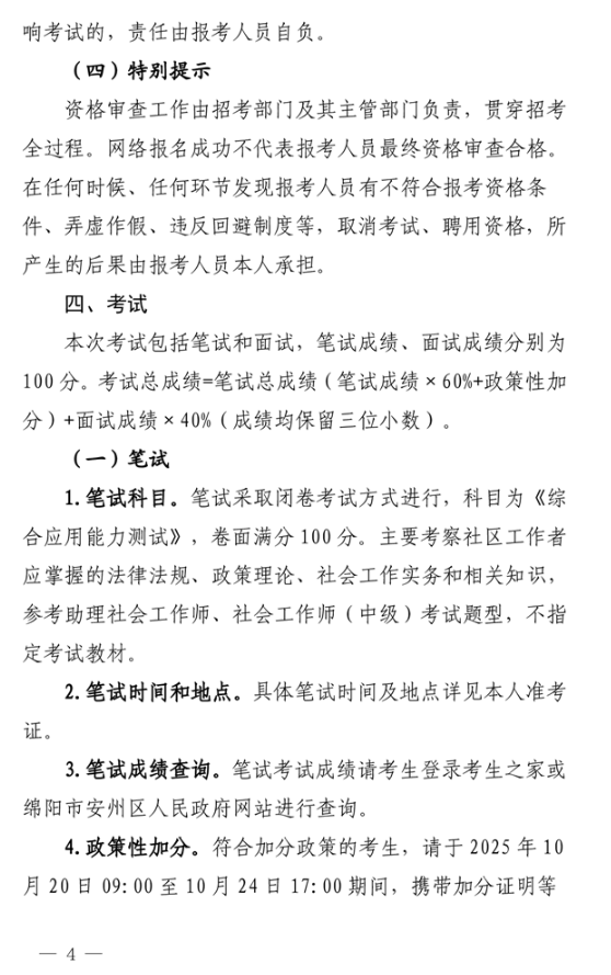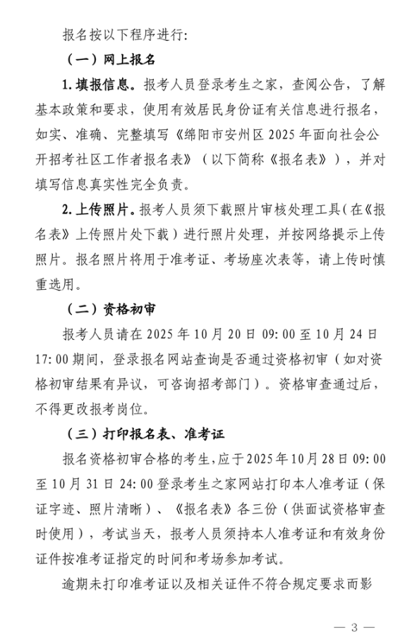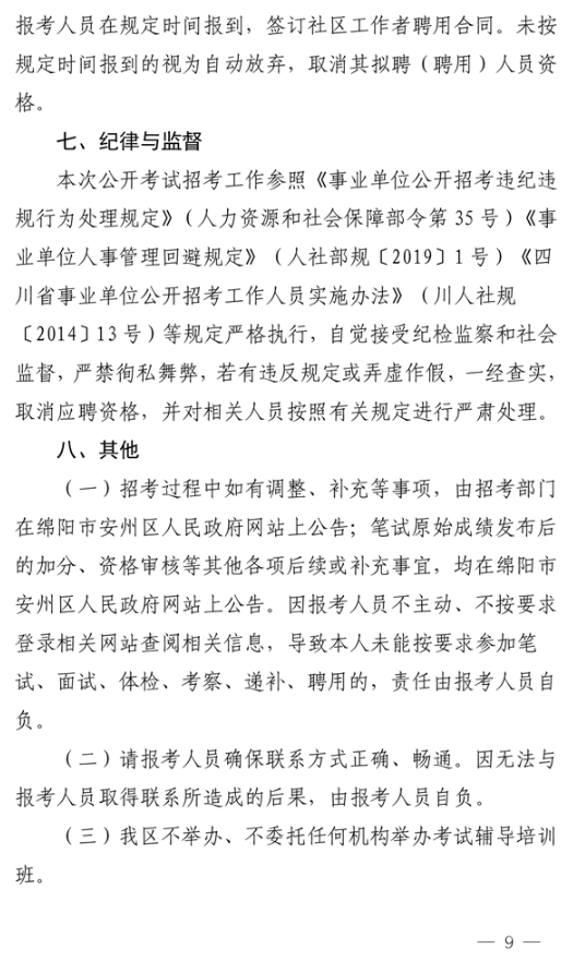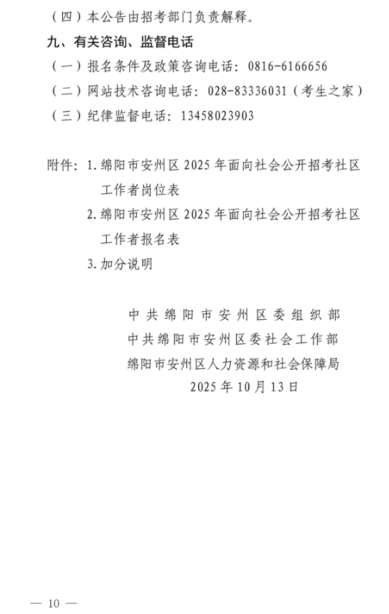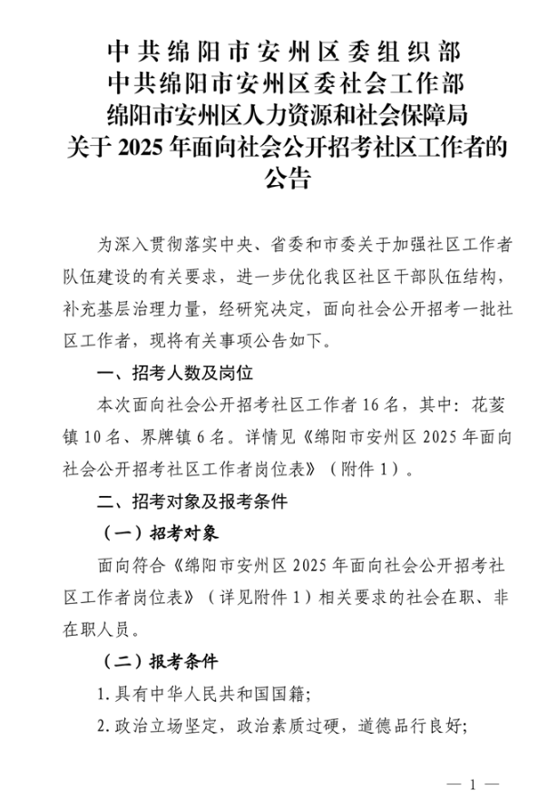 原标题:中共绵阳市安州区委组织部中共绵阳市安州区委社会工作部绵阳市安州区人力资源和社会保障局关于2025年面向社会公开招考社区工作者的公告