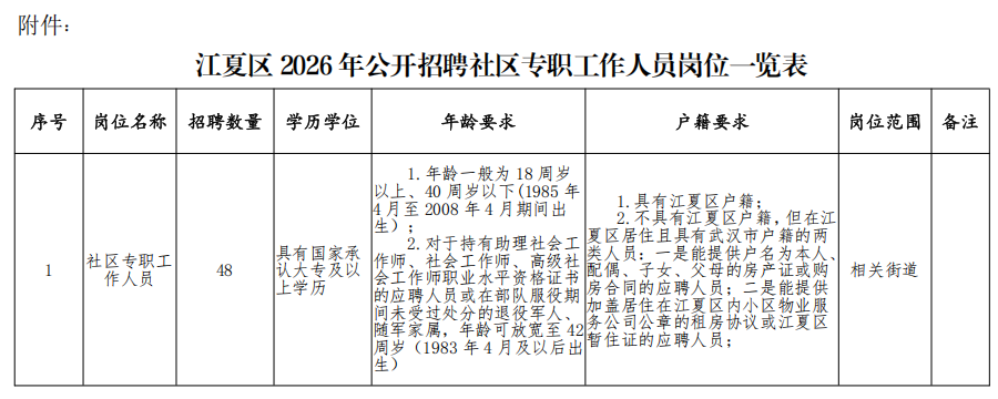 附件:《江夏区2026年公开招聘社区专职工作人员岗位一览表》