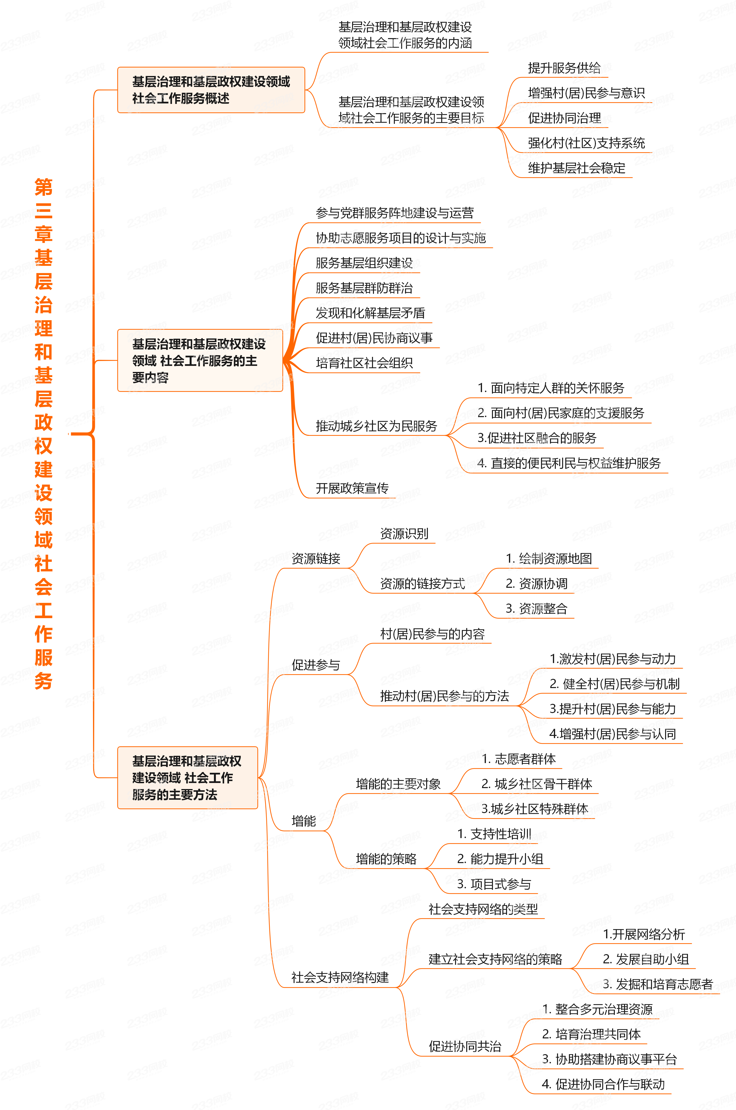 本章需要掌握基层治理和基层政权建设领域社会工作服务的主要目标、主要内容及资源链接、促进参与、增能、社会支持网络构建等方法,