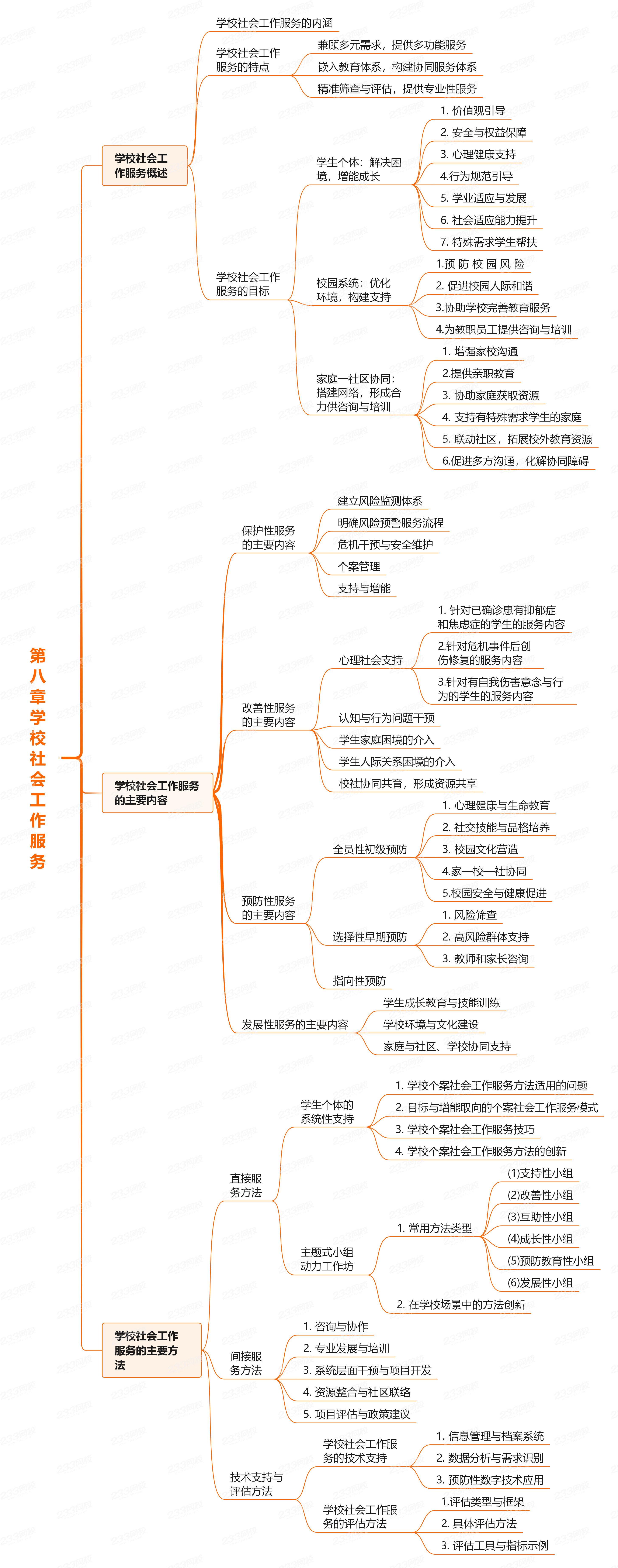 本章知识点较多,主要涉及学校社会工作服务的特点、目标、以及改善性、预防型发展性服务的主要内容和直接、间接的服务方法及技术支持与评估方法。