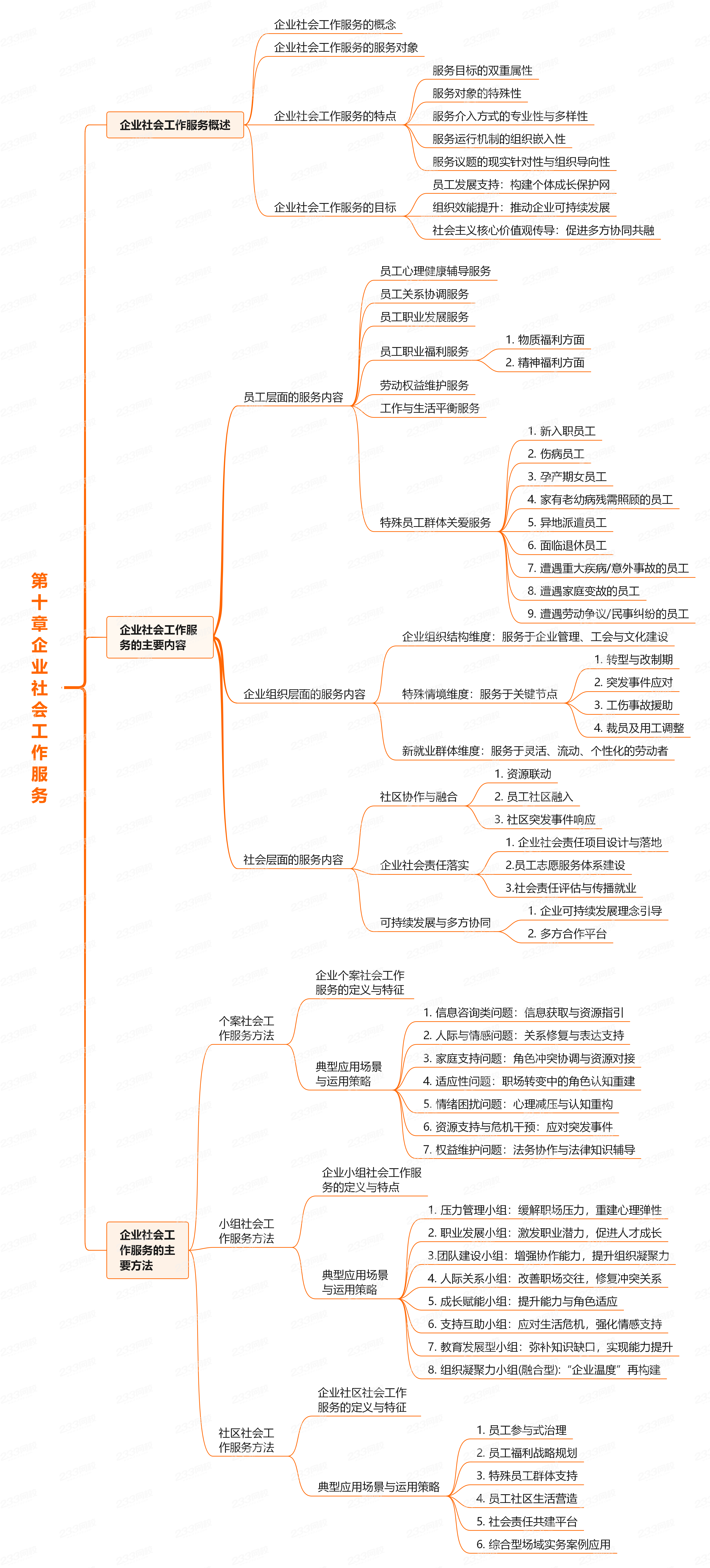 本章主要了解企业社会工作的服务对象、特点和目标,掌握从员工层面支持、企业组织层面干预、社会层面协同三个层级的内容,掌握三大工作方法的运用。如:个案社会工作服务方法针对个性化问题,如信息咨询、情绪困扰、权益维护等;小组社会工作服务方法依托共同问题形成群体支持,如压力管理小组、职业发展小组等社区社会工作服务方法推动组织生态建设,包括员工参与式治理、员工福利战略规划、社会责任共建平台等。