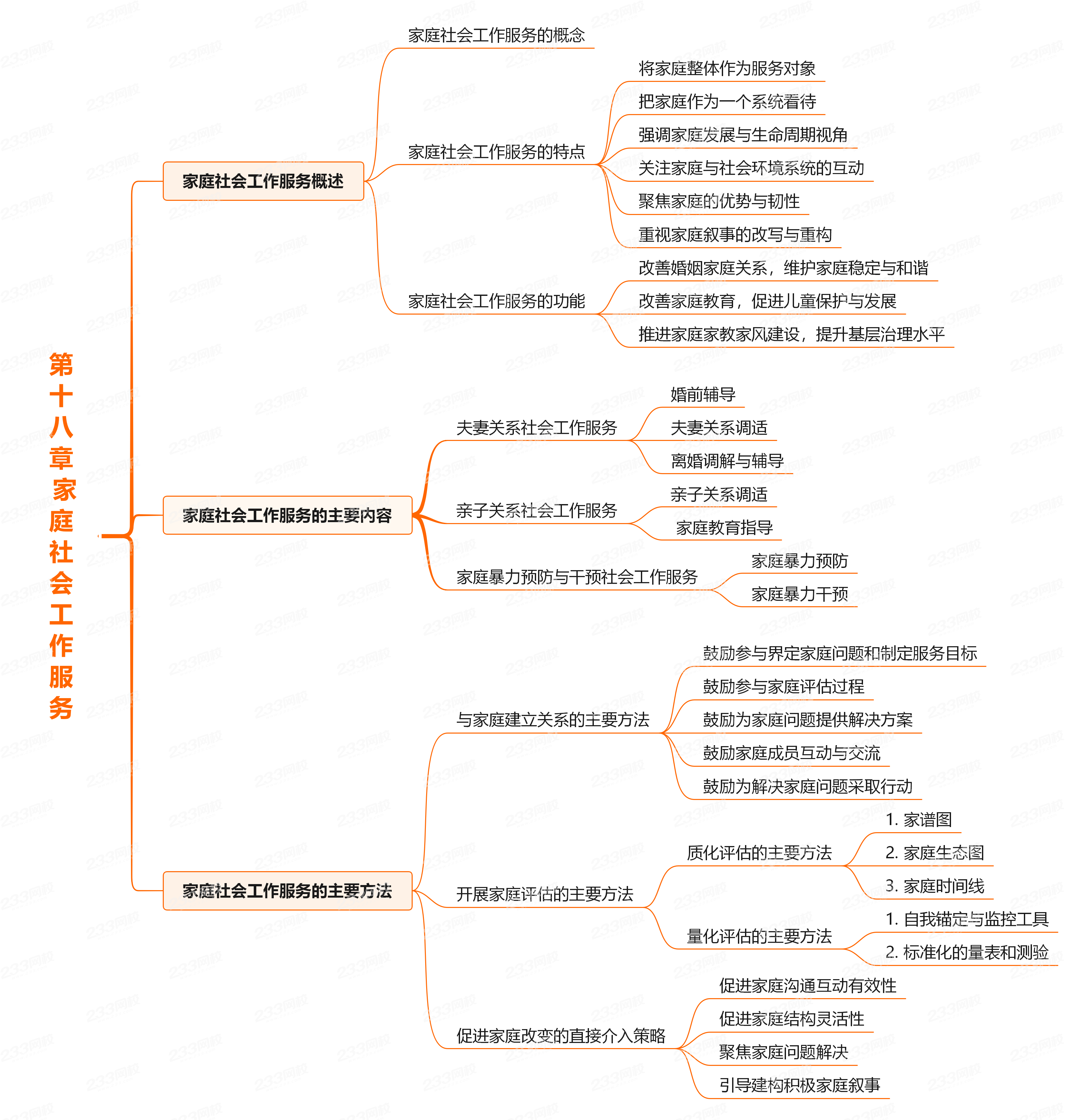 本章主要介绍家庭社会工作的特点、家庭社会工作的主要内容、家庭社会工作的主要方法。其中,需要重点注意家庭建立关系的主要方法、开展家庭评估的主要方法和促进家庭改变的直接介入策略。