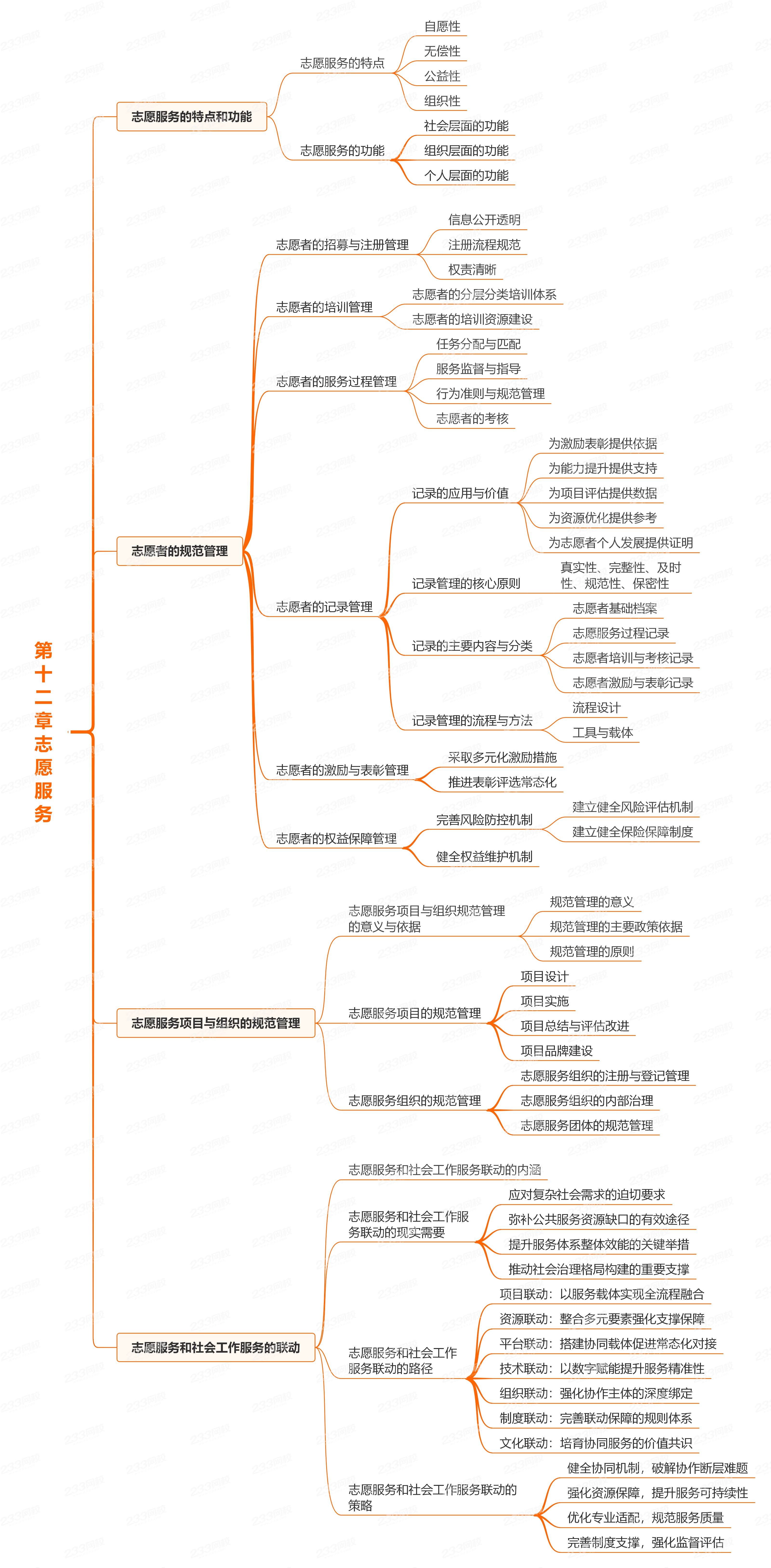 本章属于新增内容,需特别关注。(一)志愿服务的特点和功能(二)志愿者的规范管理(三)志愿服务项目与组织的规范管理(四)志愿服务和社会工作服务的联动