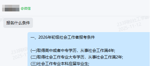 最近有不少考生询问:报名26年社会工作者需要什么条件?233网校将相关问题答案整理在下文,一起来了解一下吧!