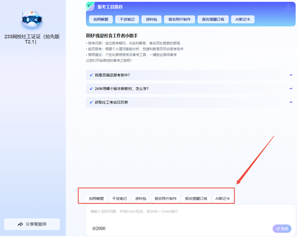 更加重要的是,这些功能都是免费开放的!无论你是初次报考、对流程一无所知的“小白”,还是工作繁忙、时间紧张的在职考生,亦或是多次备考、深陷瓶颈的“老考生”,社工报考AI助手都能匹配你的核心需求,帮你告别信息焦虑与无效备考。选择「社工AI报考助手」,就是选择更高效的报考方式、更科学的备考路径!与其在报考信息里“迷路”,不如让AI助手为你导航!