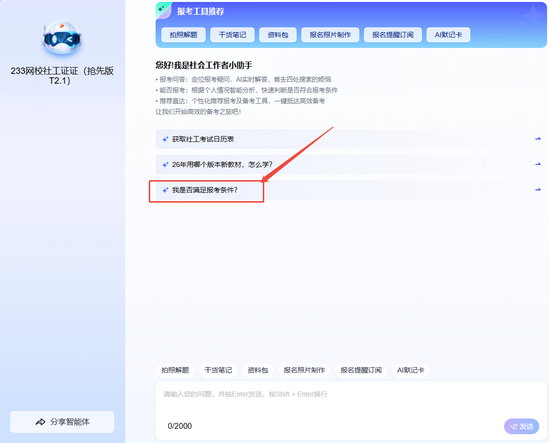 你是否还在为报考条件、流程细节、备考规划而焦虑?现在,这些问题都有了解决方案——「社工AI报考助手」全新上线!它集实时智能问答、报考条件分析、备考个性化规划于一体,7*24小时秒级响应,用AI黑科技帮你搞定报考全流程,让“信息差”不再成为通关绊脚石!