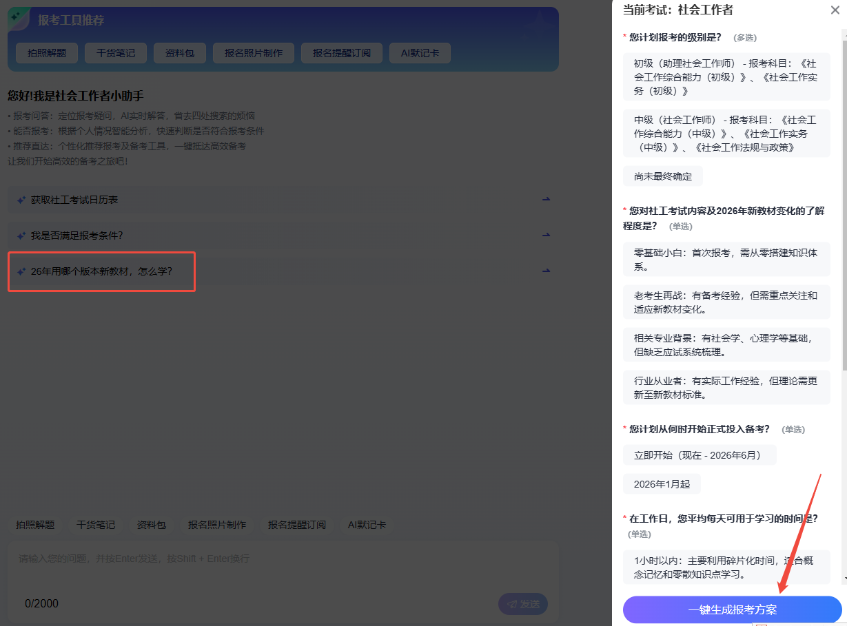 1、定制学习计划:「社工AI报考助手」会根据你的基础水平(零基础/有基础)、每日可学习时长,报考级别,结合社工备考规律,为你定制专属学习计划。从基础阶段的教材与精讲课程选择,到强化阶段的高频考点梳理、历年真题匹配,再到冲刺阶段的模拟测试与错题分析,全程给出建议,还能动态调整学习进度,帮你聚焦核心考点,大幅提升备考效率。