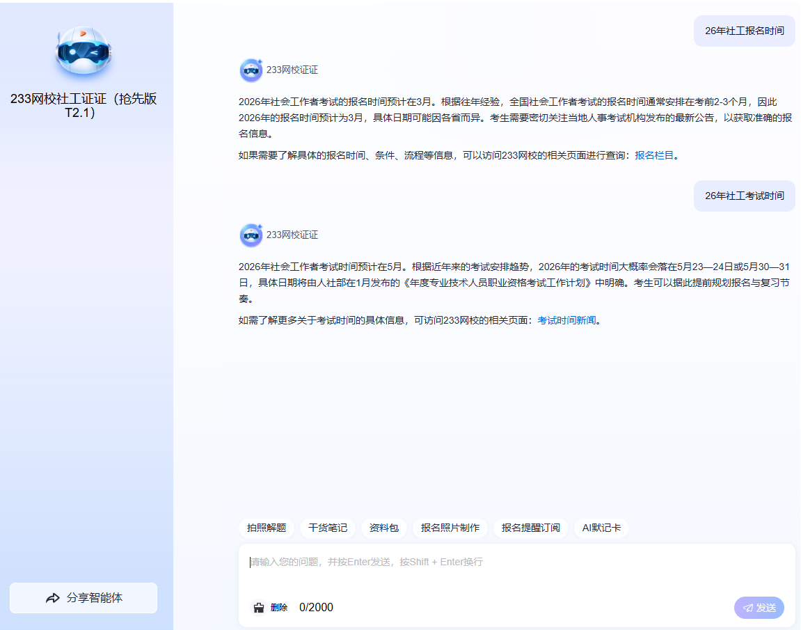 无论是报名时间、材料准备,还是考试动态、教材更新等问题,无需等待人工回复,「社工AI报考助手」即时响应,打破时间与空间限制,解决信息碎片化、咨询效率低的痛点。