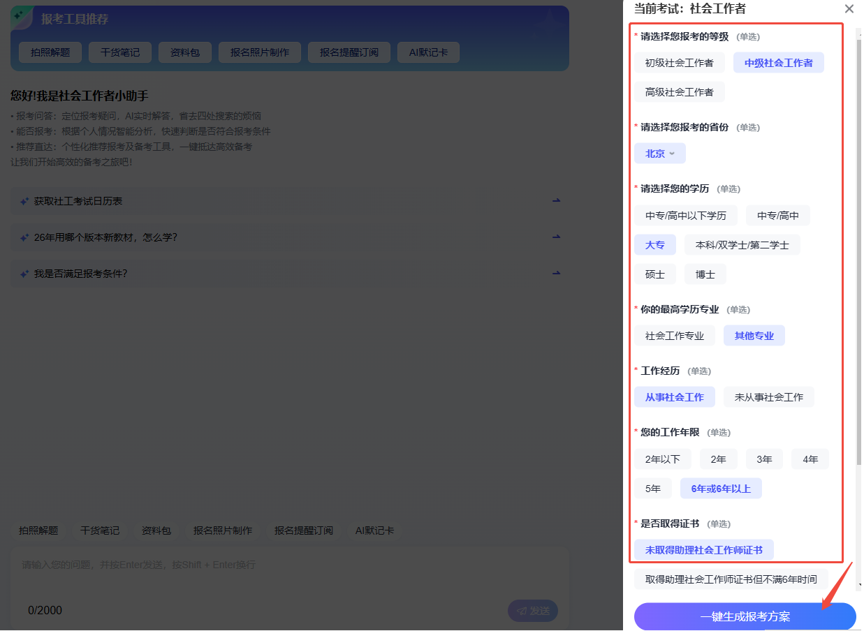 报考资格评估:只需要选择你的报考省份、学历背景、专业类别、工作年限等信息,「社工AI报考助手」便会对照各地最新报考政策及专业对照表,快速判断你是否符合报考资格并给出明确指引,避免因条件不符白忙活,或因信息填报失误错失考试资格。