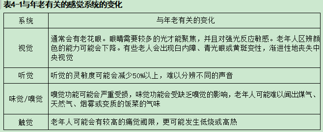 味觉/嗅觉:嗅觉功能可能会严重受损,味觉功能会受缺乏嗅觉的影响,老年人可能难以闻出煤气、天然气、烟雾或变质的饭菜的气味。