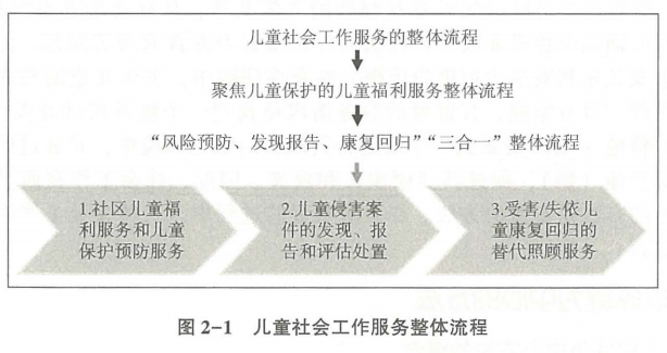 答案解析: 儿童社会工作服务的内容与整体流程包括社区儿童福利服务和儿童保护预防服务;儿童保护的发现报告和伤害评估服务;失依儿童的替代照料和康复回归服务;“三合一”的儿童社会工作服务整体流程