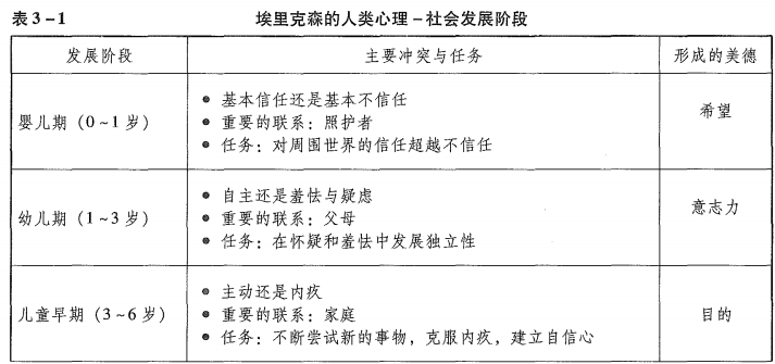 婴儿期(0-1岁)、幼儿期(1-3岁)、儿童早期(3-6岁)、儿童中期(6-12岁)、青少年期、(12-20)、成年早期(20-40)、成年中期(40-65岁)、成年晚期(老年)。