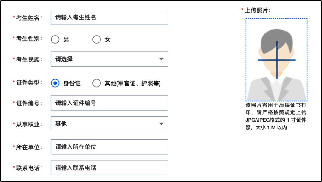 请按要求正确填写,认真核对信息,如填报内容有误或照片不符合要求,均无法参加本次考试。