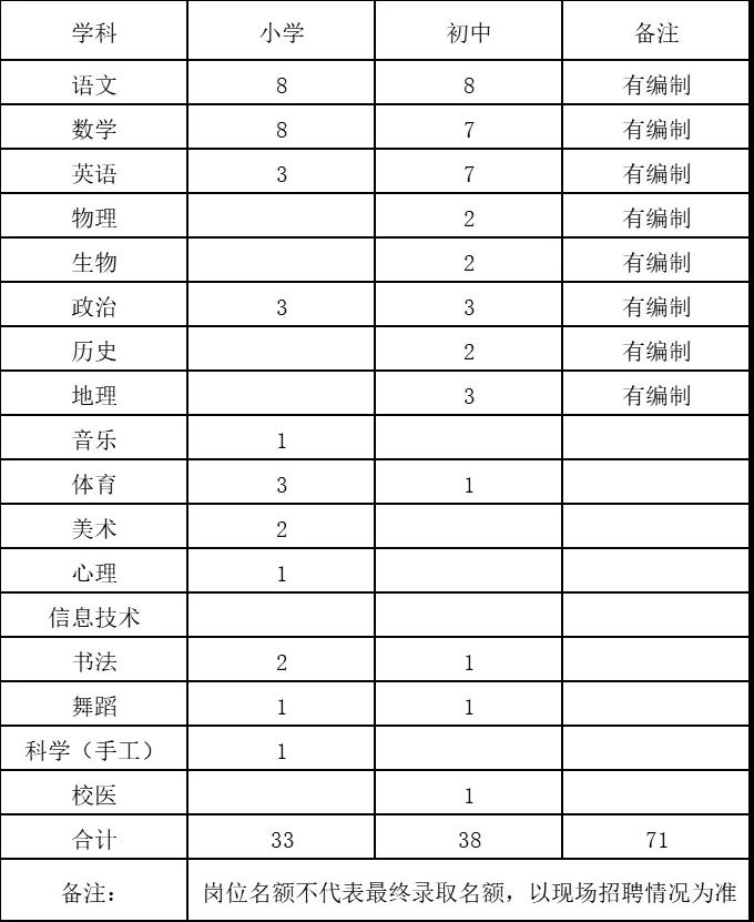招聘教职工数量共计71名,具体招聘岗位、数量如下: