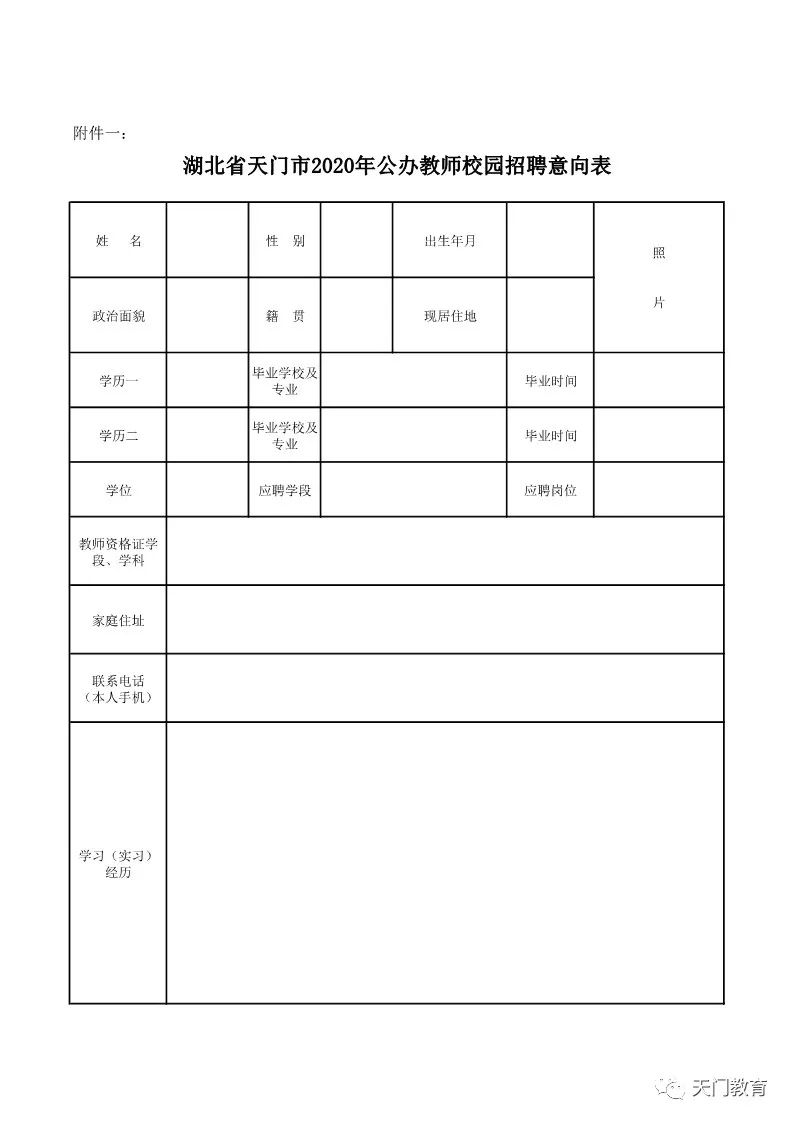 在部分省内师范类高校设立招聘点现场招聘或线上招聘。有意向参加校园招聘的高校毕业生可以填写《湖北省天门市2020年公办教师校园招聘意向表》(见附件一)并发送至邮箱:tmsjyjzgk@163.com 。