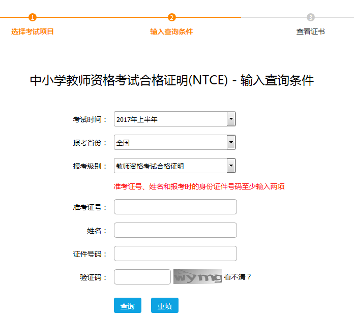 2、输入准考证号、姓名和报考时的身份证件号码(至少输入两项,证件号码区分大小写),点击查询按钮进行查询。