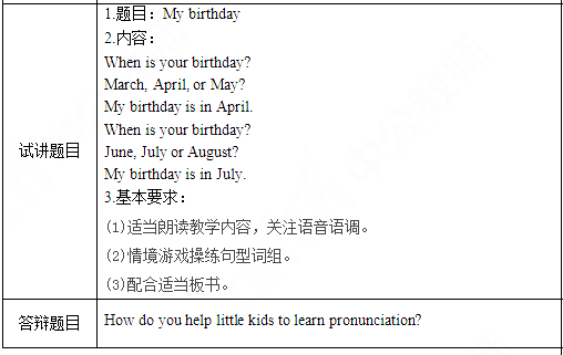 教师资格证面试试讲采取随机抽题模式,抽到试题后会有20分钟的备课时间,在试讲和答辩环节考生按准备的教案(或活动演示方案)进行试讲(或演示)。时间10分钟。下面是2018上半年小学英语教师资格证面试试讲真题《My birthday》,一起来看看面试是怎么考的吧!讲师带你还原面试现场>>