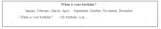 Use calendar to teach the words about month. Teach the sentence pattern “my birthday is in…” by asking, “When is your birthday?”