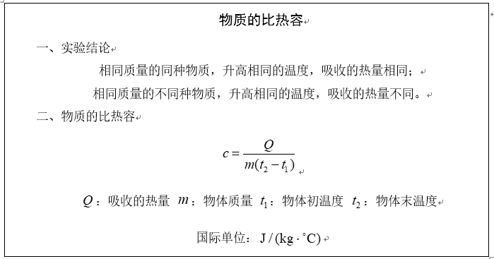 教师讲解:科学家在对以上现象进行详细研究后,揭示了一个新的物质特性,这种特性称为比热容。比热容的大小等于一定质量的某 种物质在升高(或降低)时吸收(或放出)的热量与它的质量和升高(或降低)温度的乘积之比。