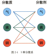 把一种(或多种)物质分散在另一种(或多种)物质中所得到的体系,叫做分散系。前者属于被分散的物质,称作分散质;后者起容纳分散质的作用,称作分散剂。按照分散质或分散剂所处的状态(气态、液态、固态),它们之间可以有9种组合方式(如图2-4)。