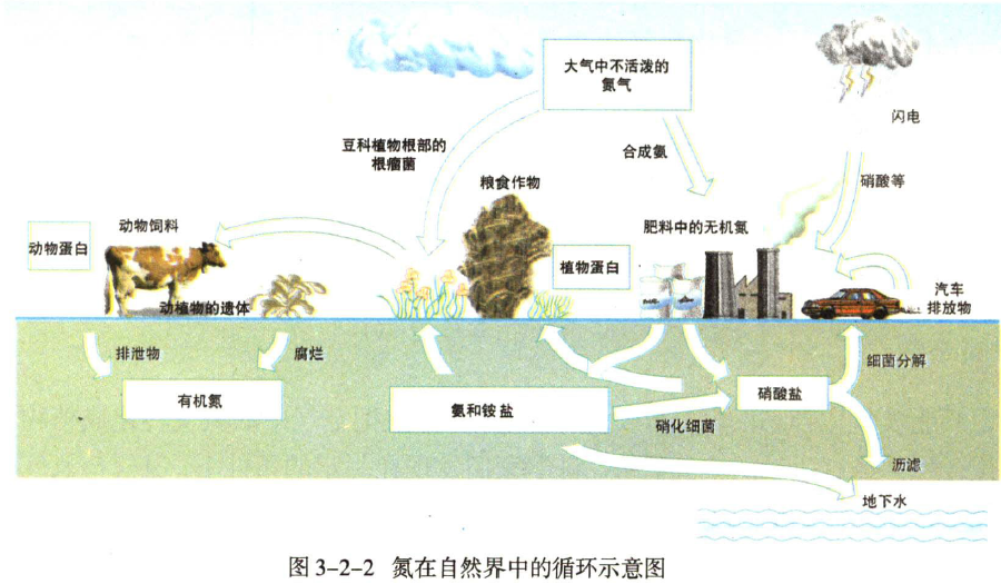在自然界中,大豆、蚕豆等豆科植物根部的根瘤菌把空气中的氮气转变为硝酸盐等含氮的化合物。植物的根从土壤中吸收的铵根离子(NH4+)和硝酸盐,经过复杂的生物转化形成各种氨基酸,氨基酸最后转化为蛋白质。动物以植物为食物而获得植物蛋白,并将其转化为动物蛋白。动植物遗体中的蛋白质被微生物分解为NH4+、NO3-、NH3,又回到土壤和水体中,被植物再次吸收利用。另外,在放电条件下,空气中少量的氮气与氧气化合生成氮的氧化物,这些氮的氧化物随水进入土壤和水体。
