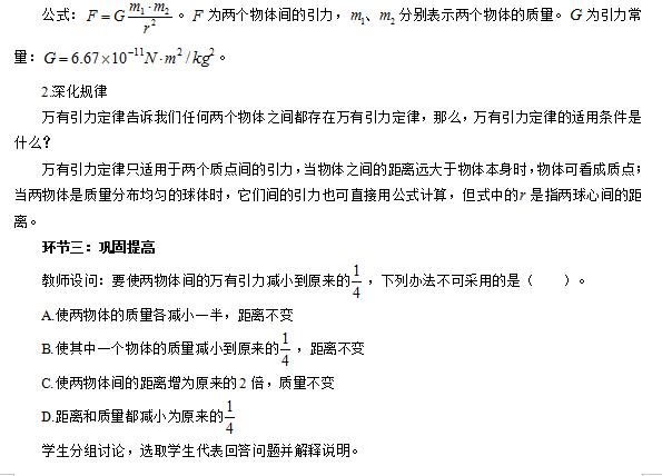 教师提问引导:既然太阳与行星之间、地球与月球之间、地球对地面物体之间的引力与两个物体的质量成正比、跟它们的距离的二次方成反比。那么我们可以更大胆设想:是否任何两个物体之间都存在这样的力?很可能有,只是因为我们身边的物体质量比天体的质量小得多,我们不易觉察。于是我们可以把这一规律推广到自然界中任意两个物体间,即具有划时代意义的万有引力定律。阅读教材,回答问题:什么是万有引力定律?