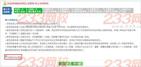 申请人阅读“网上申报协议”完毕,只有先选中“已阅读并完全同意”前的复选框,才可点击“下一步”按钮,进入申报第三步,否则系统将给出提示。