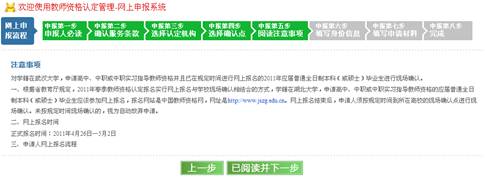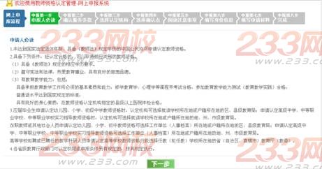 认真阅读“申请人必读”内容,尤其注意您应该选择的教育行政部门(即认定机构)。阅读完必读内容后,点击“下一步”按钮,进入申报第二步。