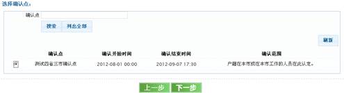确认点列表中会显示认定机构网报时间段内所有参与确认工作的确认点信息。这些信息包括确认点名称、确认范围、确认开始和结束时间。申请人需根据各现场确认点列出的确认范围,选择属于自己的确认点,并点击该确认点前的单选按钮,然后点击“下一步”按钮,进入申报第五步。