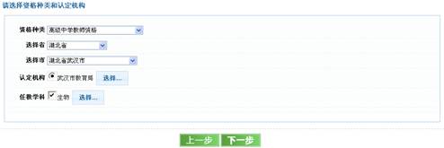 选择好认定机构后,请点击“任教学科”后的“选择”按钮,则会显示与您所选择的资格种类相对应的任教学科。在所列出的任教学科列表中选择您拟申请任教的学科。这样,您就完成了第三步所要求填写的内容。此时,请点击“下一步”按钮,进入申报第四步。
