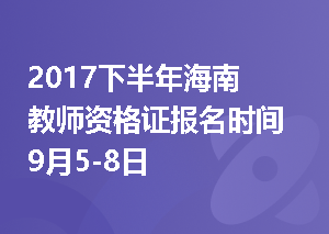 2017年下半年海南中小学教师资格证考试报名公告已发布,2017下半年海南教师资格证报名时间为9月5-8日,网上交费截止时间为9月13日。 海南省中小学教师资格考试笔试采用网上报名注册、网上审核和网上缴费的办法。 (一)网上注册。考生登录中小学教师资格考试网(http://link.233.com/27628)注册用户,签署《诚信考试承诺书》,按提示填写个人信息,上传本人照片,选择考区和考试科目。网上报名截止前,考生可反复登录报名系统修改个人报名信息,报名截止后,不再修改信息。 (二)