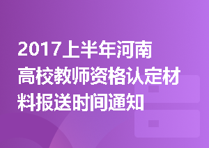 河南省教师资格认定注册服务中心关于公布2017年上半年高等院校教师资格认定材料报送时间的通知 豫教资中心〔2017〕4号 各高等院校: 根据河南省教师资格管理办公室《关于做好2017年上半年高等...