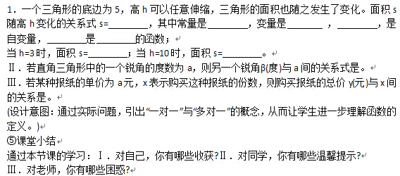 (1)教学目标:①运用丰富的实例自主学习,使学生在具体情境中能分清实例中的常量与变量,了解自变量与函数的意义。③通过小组合作与探究,学生参与变量的发现和函数概念的形成过程,以提高分析问题和解决问题的能力。③引导学生探索实际问题中的数量关系,培养对学习的兴趣和积极参与数学活动的热情。在解决问题的过程中体会数学的应用价值并感受成功的喜悦,建立自信心。