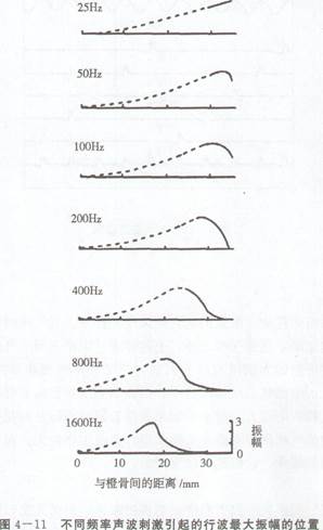 后来的研究表明,这个理论有严重的缺陷。首先,按共鸣说的要求计算,蜗顶部的纤维应比蜗底部纤维长1 000倍。但实际情况并非如此,蜗顶处横纤维仅有352~430微米,蜗底的约为64~128微米。其次,贝克西对新鲜尸体的耳蜗进行直接观察,没有发现基底膜的横纤维有足够的共振张力(而这对于共鸣说是必不可少的)。他发现,基底膜受到运动液体振动时是以行波的形式发生振动的,基底膜横纤维很少是孤立起作用的,于是提出了行波说。根据贝克西的行波学说,声波的振动作用于卵圆窗时,基底膜便产生相应的振动。振动从蜗底开始,逐渐向蜗顶推行,振动的幅度也随着逐渐加大,到基底膜的某一个部位,振幅达到最大值,然后振动停止前进而消失。随着外来声波频率的不同,基底膜最大振幅的所在部位也不同。声波频率越低,最大振幅部位越靠近蜗顶;频率越高,最大振幅部位越接近蜗底,如图4—11所示。耳蜗底部的基底膜对高、低音都能发生振动,而顶端只对低音刺激发生振动。这就是听觉的行波说。这个学说认为,基底膜对不同频率声音的分析,决定于最大振幅所在的位置。
