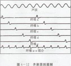 2.频率说。频率说是由拉瑟福德在1886年提出的。他认为,声音的频率是由听神经中神经元发放的速率来编码的。例如,听到一个频率为2 000Hz的声音,听神经的第一级神经元每秒钟必须发放2 000个动作电位。但生理学的研究表明,听觉通路中的单一神经元冲动发放速率根本不能快于1 000Hz。也就是说,单一的听觉神经纤维是不能传递人类听觉范围的所有频率的。为此,温弗尔在1949年提出了齐射说。他认为,声音频率在400Hz以内时,单一神经纤维以符合频率的发放速率发放冲动。但当频率增高时,由于神经纤维之间存在着合作和相互联系,就产生神经齐射现象。这样,神经纤维发放冲动的总效应就能体现声波的频率。但当声波频率超过5 000Hz时,听神经就不再产生同步放电。因此,齐射说只能对5 000Hz以下的声音的听觉进行解释。如图4—12所示,每条纤维对每种声波做出反应,反应的汇集代表声波的全部频率。