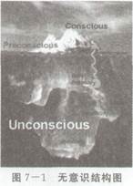 无意识是相对于意识而言的,是个体不曾觉察到的心理活动和过程。按照弗洛伊德的观点,无意识包括大量的观念、愿望、想法等,这些观念和愿望因为和社会道德存在冲突而被压抑,不能出现在意识中。如果把人的心理比作一座冰山的话,那么人的意识便是露出水面的冰山顶端,它只占人的心理很小的部分,大部分的心理活动是无意识的,如图7—1所示。
