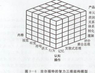 2.三维结构理论。吉尔福德在20余年因素分析研究的基础上于1967年创立了智力三维结构模型理论,认为智力结构应从操作、内容、产物三个维度去考虑。智力活动就是人在头脑里加工(即操作过程)客观对象(即内容),产生知识(即产物)的过程。智力的操作过程包括认知、记忆、发散思维、聚合思维、评价5个因素;智力加工的内容包括图形(具体事物的形象)、符号(由字母、数字和其他记号组成的事物)、语义(词、句的意义及概念)、行为(社会能力),共4个因素;智力加工的产物包括6个因素,即单元、类别、关系、系统、转换、蕴涵。这样,智力便由4X6×5=120种基本能力构成,如图9—6所示。