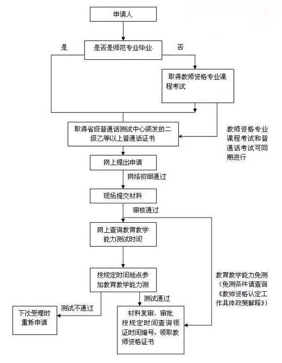 2011年及以前入学的全日制普通高等院校师范类专业应届毕业生,可以持毕业证书申请直接认定相应的教师资格。2012年及以后入学的师范类专业、非师范类专业毕业生及成人高校毕业生,申请上述教师资格者,均须参加中小学和幼儿园教师资格考试。