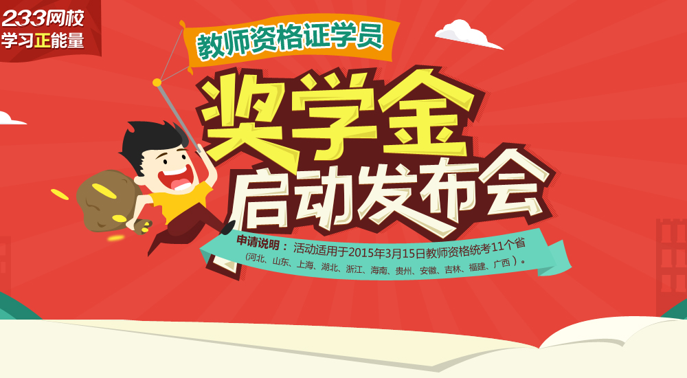 为了倡导和弘扬233网校学子拼搏进取的学习精神,233网校2015年特首次设立教师资格网校学员奖学金。网校希望以奖学金的形式鼓励和嘉奖那些积极上进、热爱学习的学员们,并希望通过他们的成功学习的经历激励和影响更多的人,传递更多的学习正能量!提示:奖学金申请时间截止到4月20日。
