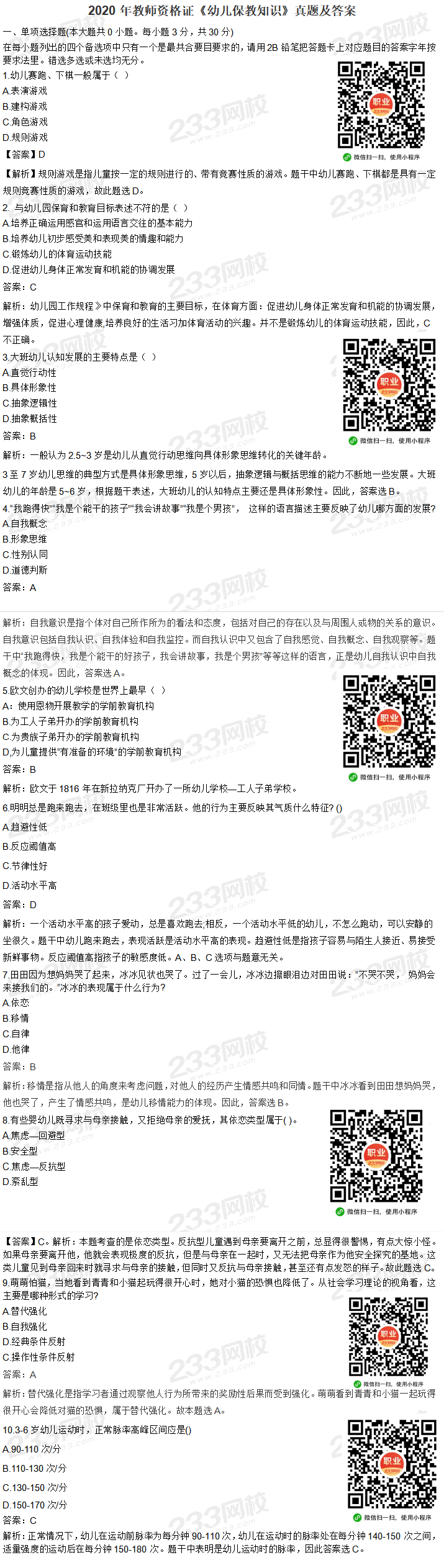考后,233网校会及时对2020年教师资格幼儿保教知识真题讲解,分析难度,考核重点等。敬请关注!