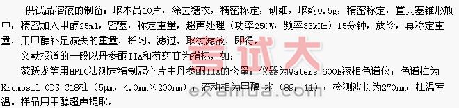 色谱条件与系统适用性试验:以十八烷基硅烷键合硅胶为填充剂;以甲醇-水(80:20)为流动相;检测波长为270nm。理论板数按丹参酮IIA峰计算应不低于3000。