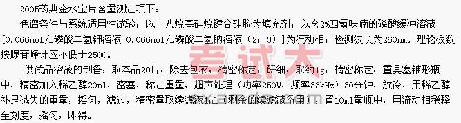 许妍等建立了金水宝片的质量标准的研究,用薄层色谱法鉴别了氨基酸、甘露醇,用反相高效液相色谱法测定了腺苷的含量。含量测定时,采用waters 209系列高效液相色谱仪;色谱柱为国产YWG-C18柱(4.6mm×300mm);柱温:室温;流动相为2%四氢呋喃的磷酸缓冲溶液 [0.066mol/L磷酸二氢钾溶液-0.066mol/L磷酸二氢钠溶液(4:6)]为流动相;流速为1mL/min;检测波长为260nm。腺苷的线性范围为0.05~0.01μg;平均加样回收率为98.91%,RSD为1.3%。样品用50%乙醇超声处理。
