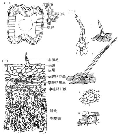 (一)茎横切面简图(×8.4) (二)茎横切面详图(×176) (三)解离组织图(×176)