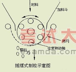 稠膏或干浸膏细粉制软材时可用槽形混合机,制颗粒时可用摇摆式或旋转式颗粒机,干浸膏细粉亦可用干式制粒机,直接挤成颗粒。[摇摆式制粒示意图]