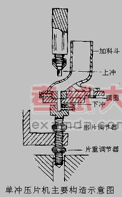此种压片机是由转动轮、加料斗、模圈、上下两个冲头、三个调节器(压力、片重、出片)和一个能左右移动的饲料器组成。压力的大小,主要靠压力调节器连接上冲杆内,可调节上冲升降,调节上冲与下冲间的距离,上冲下降愈低,上下冲头距离愈近,则压力愈大,因而片剂愈硬;反之,片剂则愈松。片重的调节,下冲杆附有两个调节器,上面一个为调节冲头,使与模圈相平,叫出片调节器,下面一个是调节下冲的下降深度,即调节片剂的重量,叫片重调节器。如片重轻时,转动调节器,使下冲杆下降,则增加了模孔的容积,使片重增加;如片重过大,转动调节器,使下冲杆上升,以减少填充颗粒的容积使片重减轻。片重经过调节后,压力也应作相应调整。